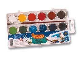 Akvareliniai dažai JOVI. Pagaminti vandens pagrindu. Tinka piešti teptuku. Spalvas galima lengvai maišyti. Ypatingai tinka vaikams, nes lengvai išsiplauna iš įvairių rūšių audinių. Skirti vaikams nuo 3 metų. 12 spalvų rinkinys. Spalvos neblunka saulėje.