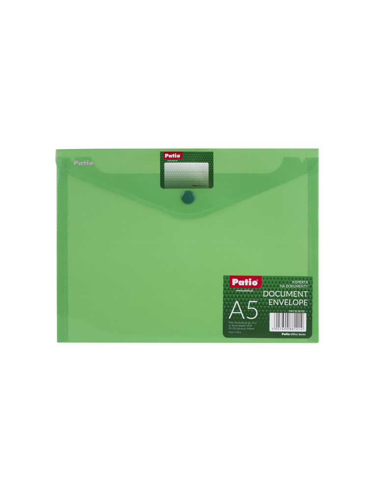 Aplankas (vokas) su spaustuku PATIO, A5, PP, žalia – idealus sprendimas jūsų dokumentams saugoti ir organizuoti. Šis praktiškas aplankas yra puikus pasirinkimas tiek mokyklai, tiek darbui, nes jo funkcionalumas ir stilius leis jums išlaikyti tvarką bet kurioje situacijoje.