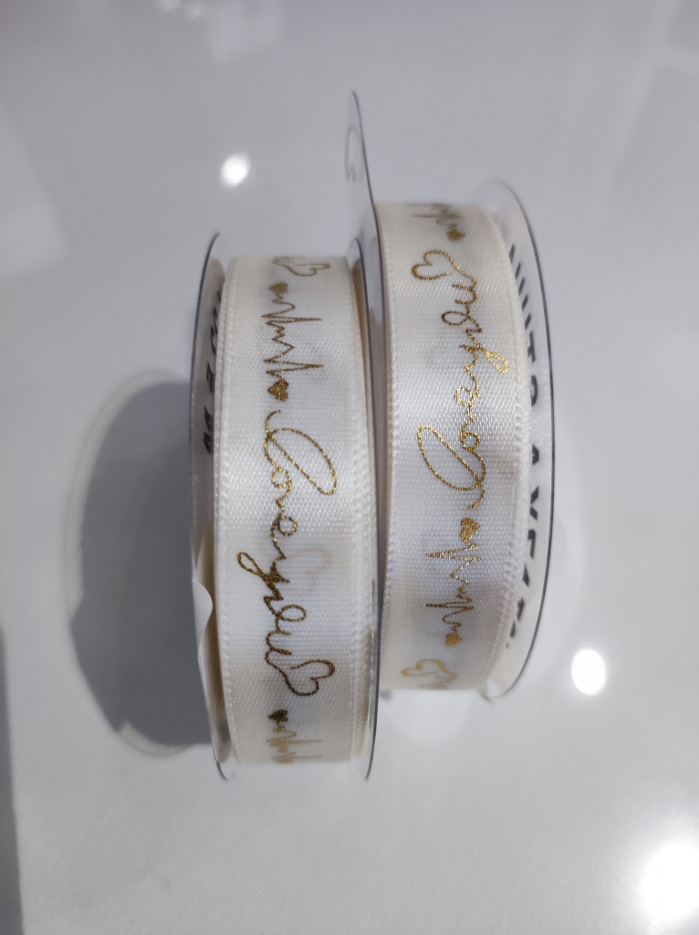 Atlasinė juostelė 15mm x 22,5m su aukso sp. užrašu smėlio sp.