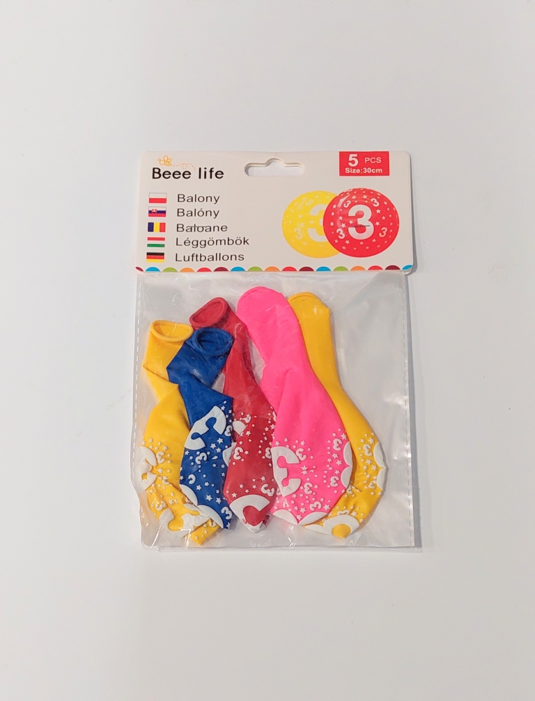 Balionai įv.spalvų 5vnt. "Skaičius 3" 30cm.