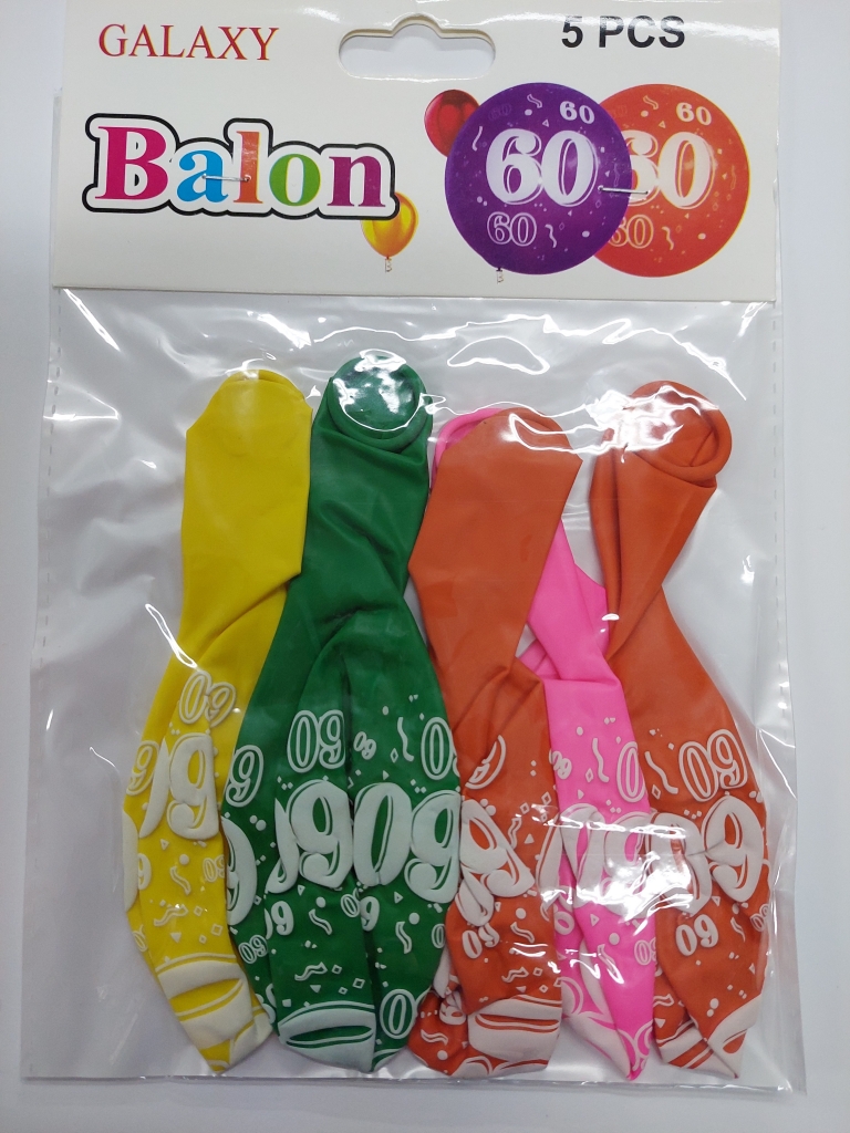 Balionai įvairių spalvų su užrašu 60, 5 vnt.