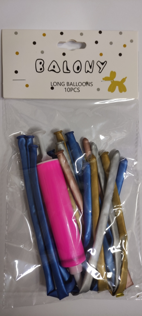 Balionai metalizuoti ilgi su pompa 10vnt