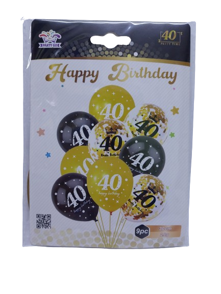 Balionai skaičius "40" 30cm. - 9 vnt. aukso,juodos spl.