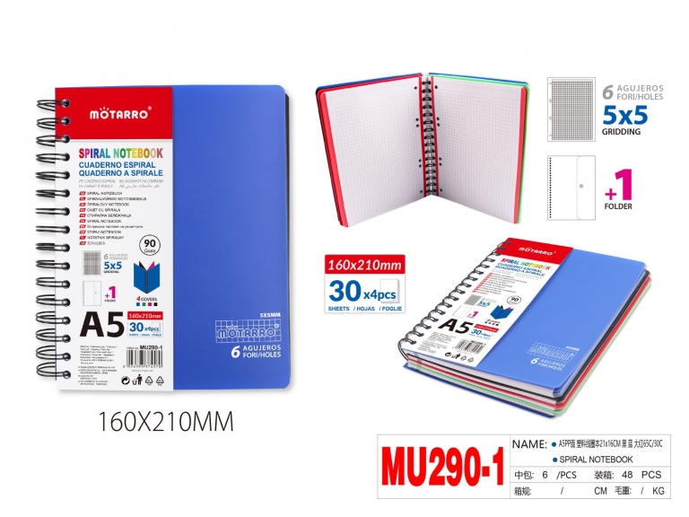 Bloknotas A5 120 lapų langeliais 90gm2 spiralinis įrišimas šone su trimis skirtukais įvairių sp plastikinis viršelis MOTARRO