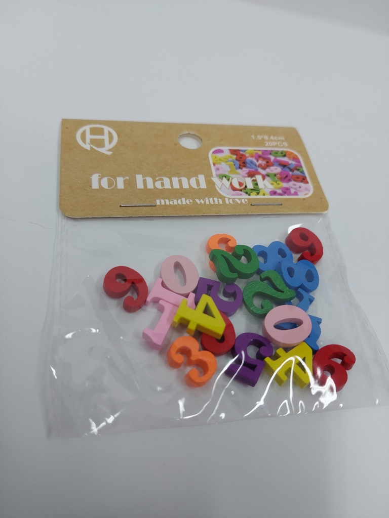 Dekoracija rankdarbiams Skaičiai mediniai 1.5x0.4cm. įvair. sp. 20 vnt.