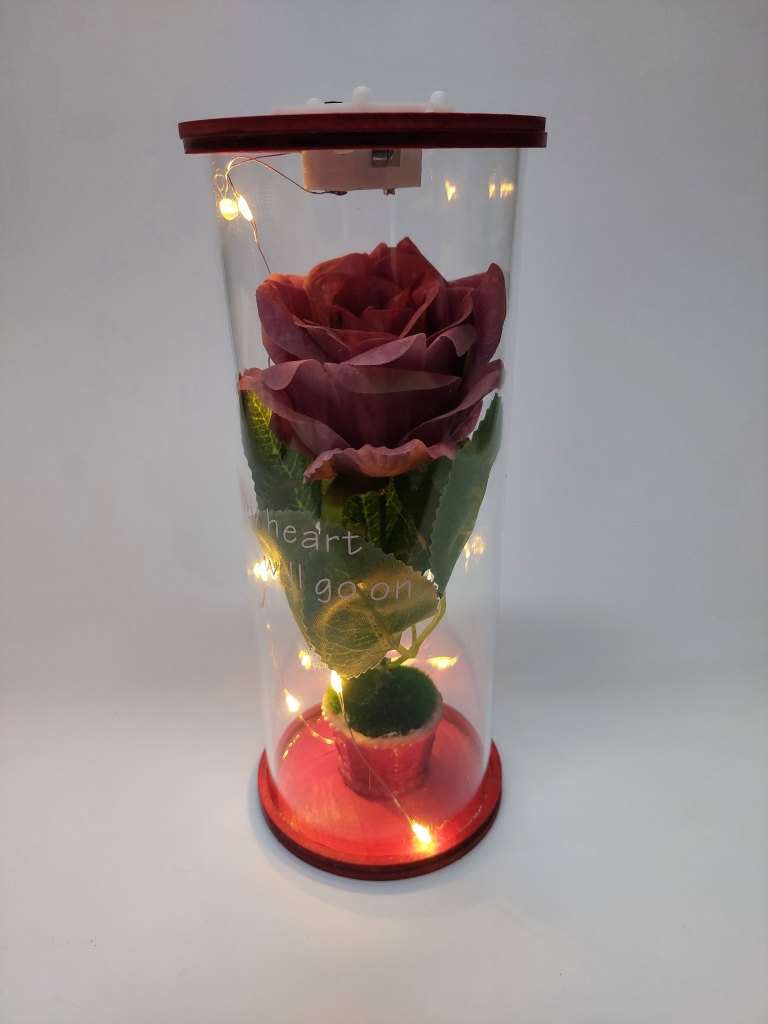 Dekoracinė rožė stikliniame cilindre su LED lemputėmis, 8,5x8,5x20cm