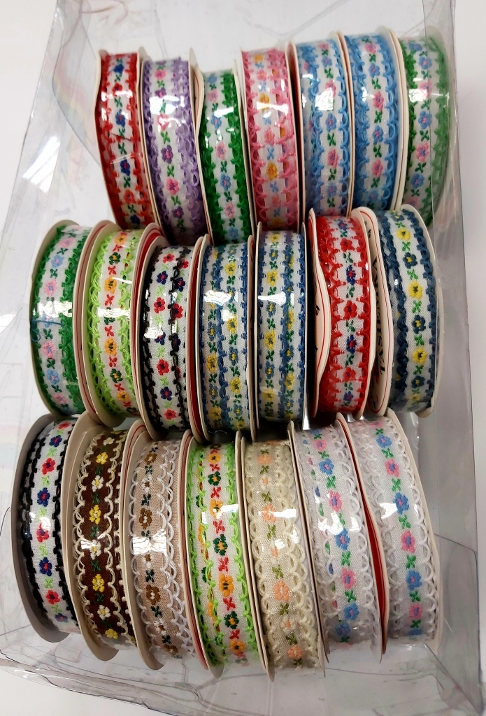 Dekoruota gėlytėmis juostelė įvairių spalvų 1,5cmx1m
