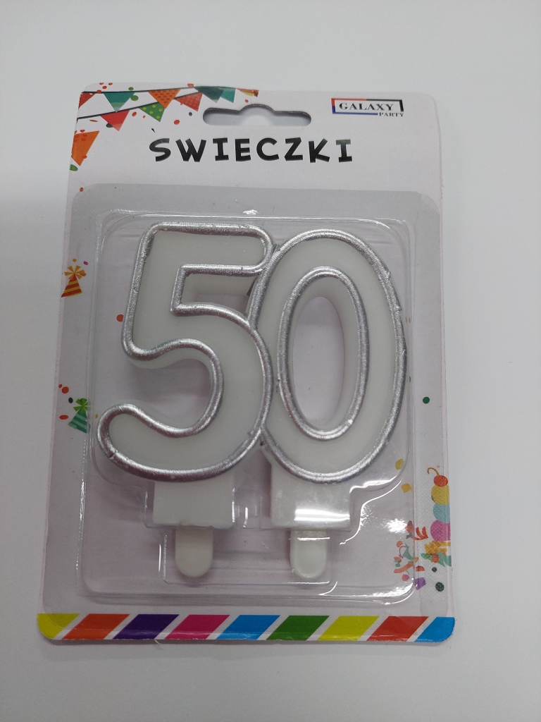 Gimtadienio žvakė balta su užrašu 50, 1 vnt.