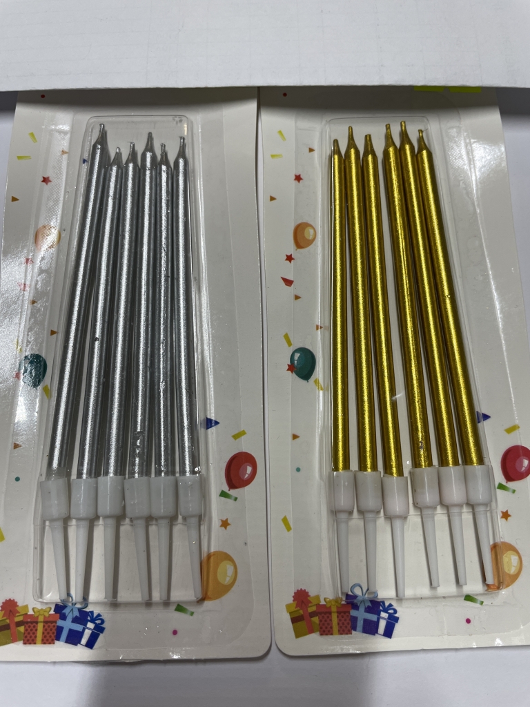 Gimtadienio žvakutės, auksinės arba sidabrinės, 6 vnt. 7,5x18 cm.