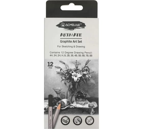 - Įvairūs kietumo laipsniai: Rinkinį sudaro 12 pieštukų su skirtingais kietumo laipsniais, leidžiančių kurti įvairius efektus – nuo subtilių linijų iki tamsių šešėlių.