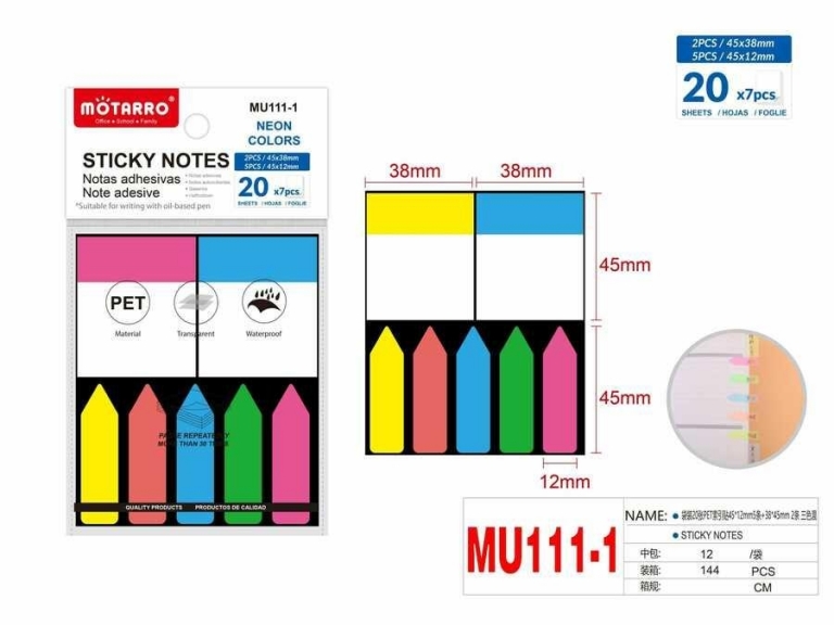Indeksai lipnūs spalvoti plastikiniai 45x12mm 5sp x 20lapų 45x38mm 2sp x 20lapų MOTARRO