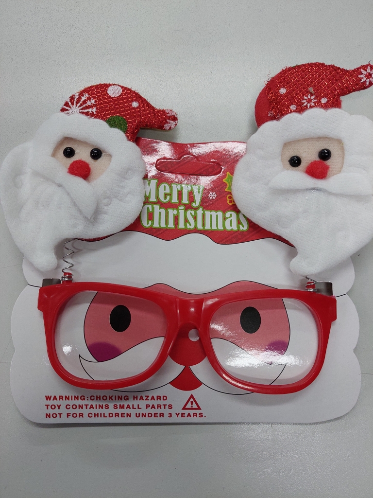 Kalėdiniai akiniai, raudoni su virš jų spyruokliuojančiais kalėdų seneliais