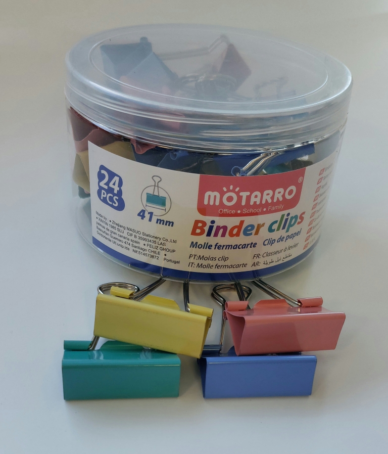 Kanceliariniai spaustukai 41mm (24vnt) spalvoti MOTARRO – tai puikus pasirinkimas visiems, kurie nori suteikti savo dokumentams spalvą ir tvarką. Šie spaustukai ne tik padės organizuoti jūsų popierius, bet ir pridės žaismingumo jūsų darbo aplinkai.