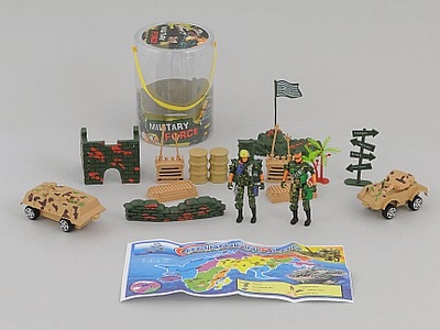 Karinės technikos ir kareivėlių rinkinys kibirėlyje