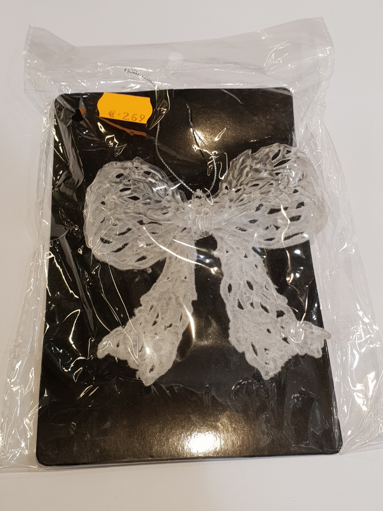 Kaspinas plastikinis dekoravimui 11x11x2,5 cm, baltos spalvos tinka eglės papuošimui.