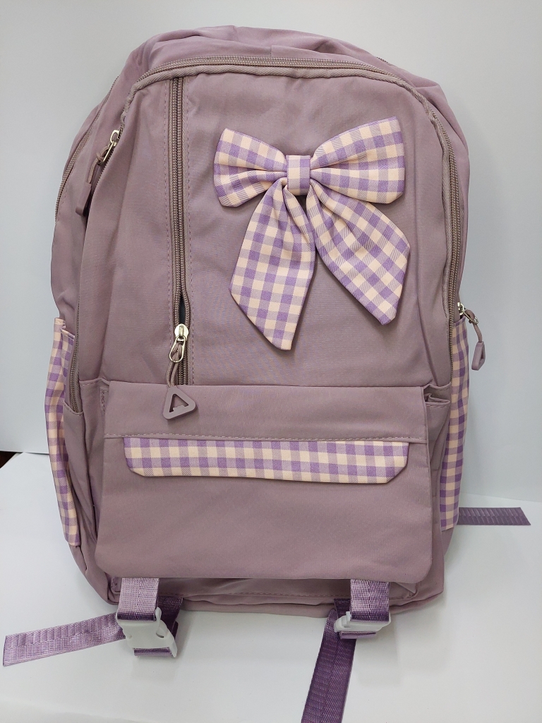 Violetinės spalvos su languotu kaspinu, dviejų skyrių su užtrauktuku.. soninemis kišenėlėmis.