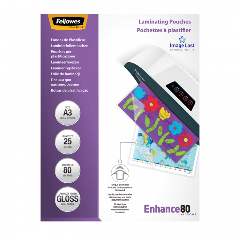 Laminavimo vokeliai FELLOWES. A3 formatas. Vokelių storis 80 mikronų. Pakuotėje yra 25 vnt.
