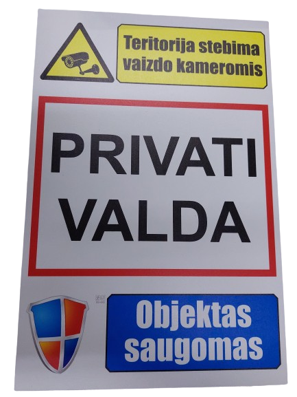 Lentelė plastikinė Privati valda; Teritorija stebima vaizdo kameromis; Objektas saugomas 300x200mm.