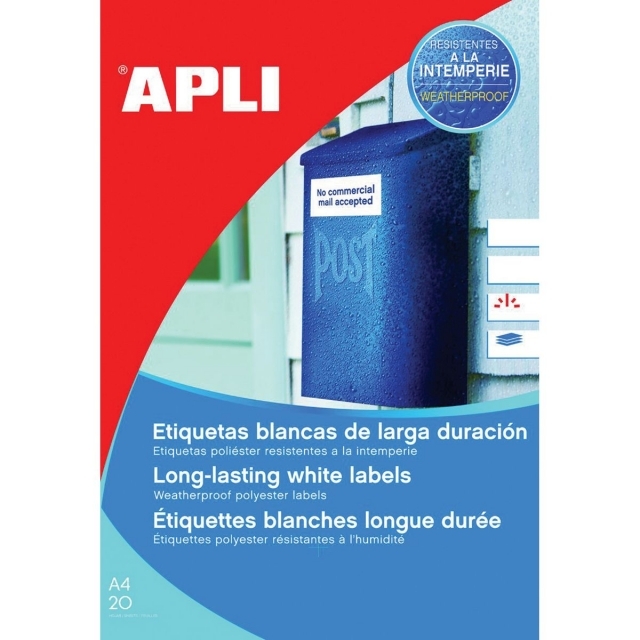 Lipnios etiketės APLI, 210 x 297 mm, A4 1 lipdukas lape, 20 lapų, balta, atsparūs aplinkos poveikiui