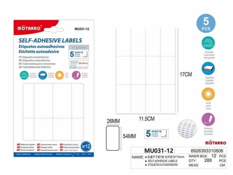 Lipnios etiketės MOTARRO baltos sp 26x54mm 12vnt x 5lapai