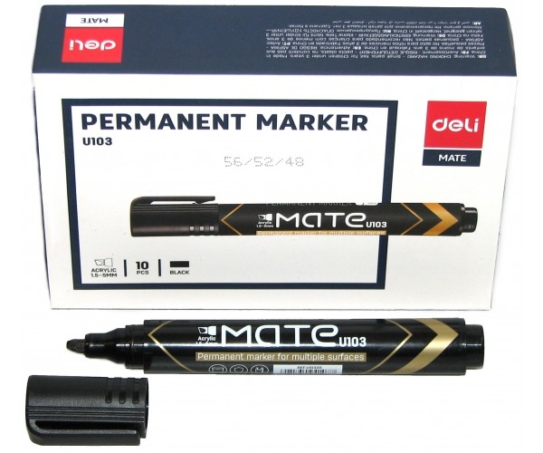 Permanentinis žymeklis Deli Mate U10320, juodas, kirstu galu. Brėžio storis 1.5-5mm. Pakartotinai užpildomas rašalu.