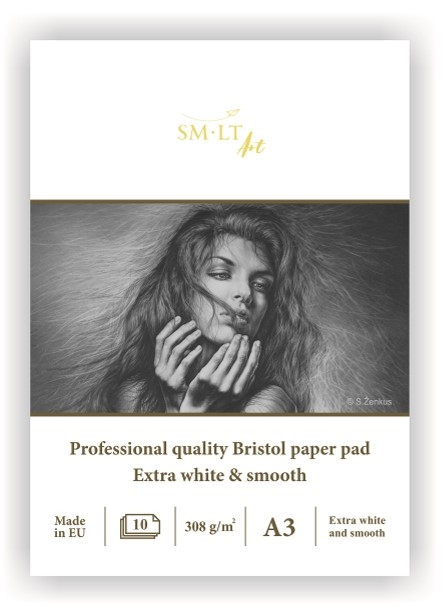 Itin baltas ir lygus Bristol popierius. Paviršius švariai nusitrina ir yra tinkamas visų rūšių eskizams, o geriausiai tinka pieštukams, rašikliams, markeriams, kaligrafijai. Klijuotas, kieta nugarėle.