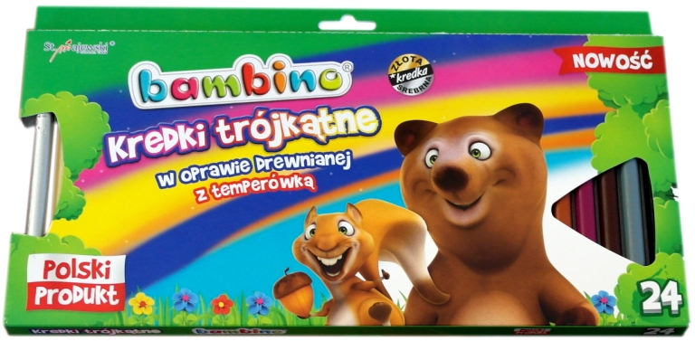 Aukštos kokybės pieštukai Jie pasižymi labai intensyvumu sočiųjų spalvų. Puikiai jie padengia, idealiai tinka piešimui, pildant didelius plotus ir atlikti minkštus perėjimus tarp spalvų. Yra aukso ir sidabro spalvos. Pieštukas yra storas, tinkamai subalansuotas, kuris puikiai tinka į mažo vaiko ranką. Jie gaminami Lenkijoje, laikantis Europos Parlamento ir Tarybos direktyvos dėl žaislų ir Reglamento Ūkio ministerija esminių reikalavimų žaislų saugos, užtikrinant pieštukai Bambino saugumą.