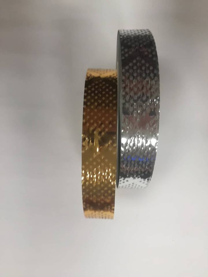 2 cm pločio, 25 m ilgio juostelė . Dvi spalvos: auksinė, sidabrinė