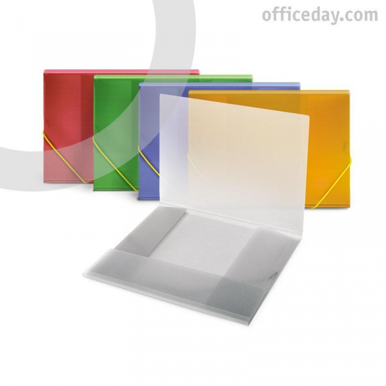 Aplankas su gumele. Pagamintas iš tvirto plastiko. Galimas išplėtimas iki 2 cm. Su trimis atvartais. A4 formatas. Matmenys: 315x240 mm. Permatomas, raudonos spalvos.