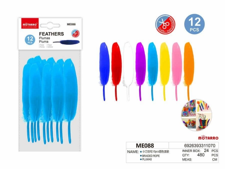 Plunksnos 20x120mm 12vnt įvairių spalvų MOTARRO – tai puikus pasirinkimas visiems, kurie nori papildyti savo kūrybinius projektus spalvingomis ir išskirtinėmis detalėmis. Šios plunksnos ne tik suteikia ryškumo ir žavesio, bet ir yra universalios, todėl tinka įvairioms rankdarbių, dekoravimo ar dovanų gamybos idėjoms.