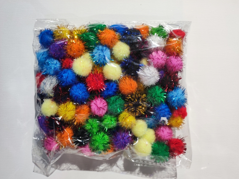 Pomponai 20mm įvairių spalvų su blizgučiais