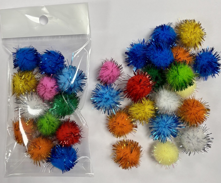 Pomponai 20mm įvairių spalvų su blizgučiais 12vnt