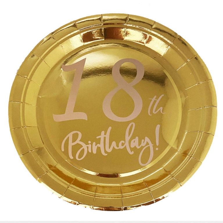 Popierinės lėkštutės "18th Birthday!", aukso spl., baltas užrašas, 6vnt.