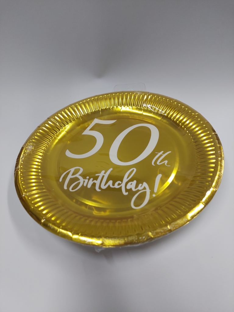 Popierinės lėkštutės ''50th Birthday!", aukso spl., baltu užrašu, 6vnt.