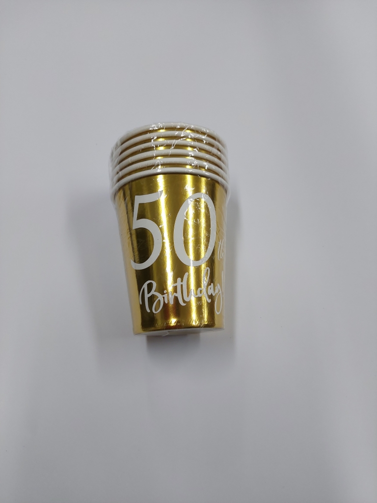 Popieriniai puodeliai "50th Birthday!", aukso spl., 6vnt.