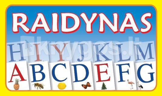 Kortelėms laikyti skirta patogi dėžutė. Raidynas rekomenduojamas vyresniojo ikimokyklinio ir jaunesniojo mokyklinio amžiaus vaikams.