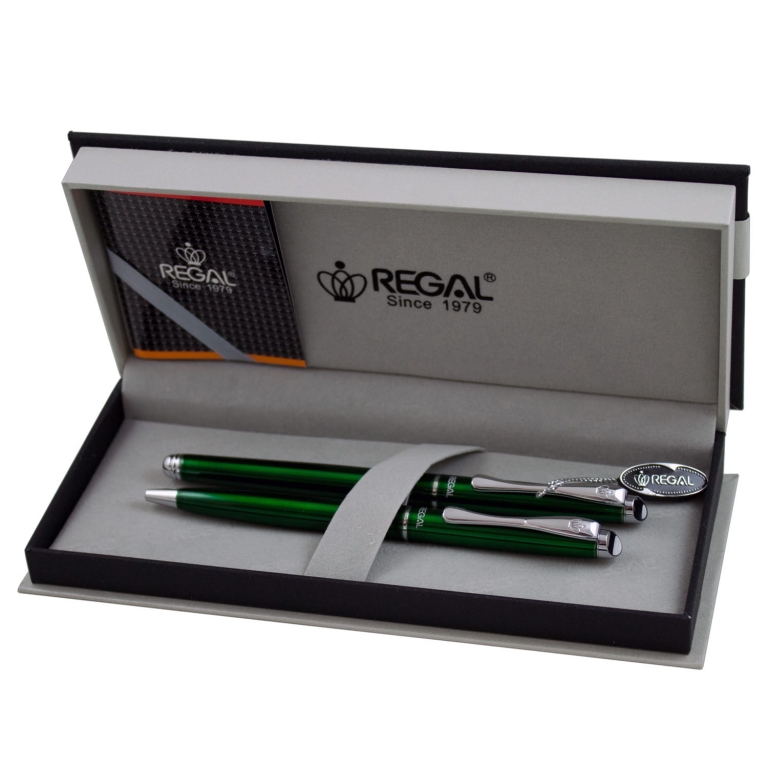 Elegantiškas rašiklių rinkinys "REGAL" firmos, įpakuotas gražioje firminėje odinėje dėžutėje, kurį sudaro parkeris ir rašiklis. Dėžutės vidus išklotas švelnia pilkos spalvos veliūrine medžiaga. Tai puiki dovana draugui ar verslo partneriui.