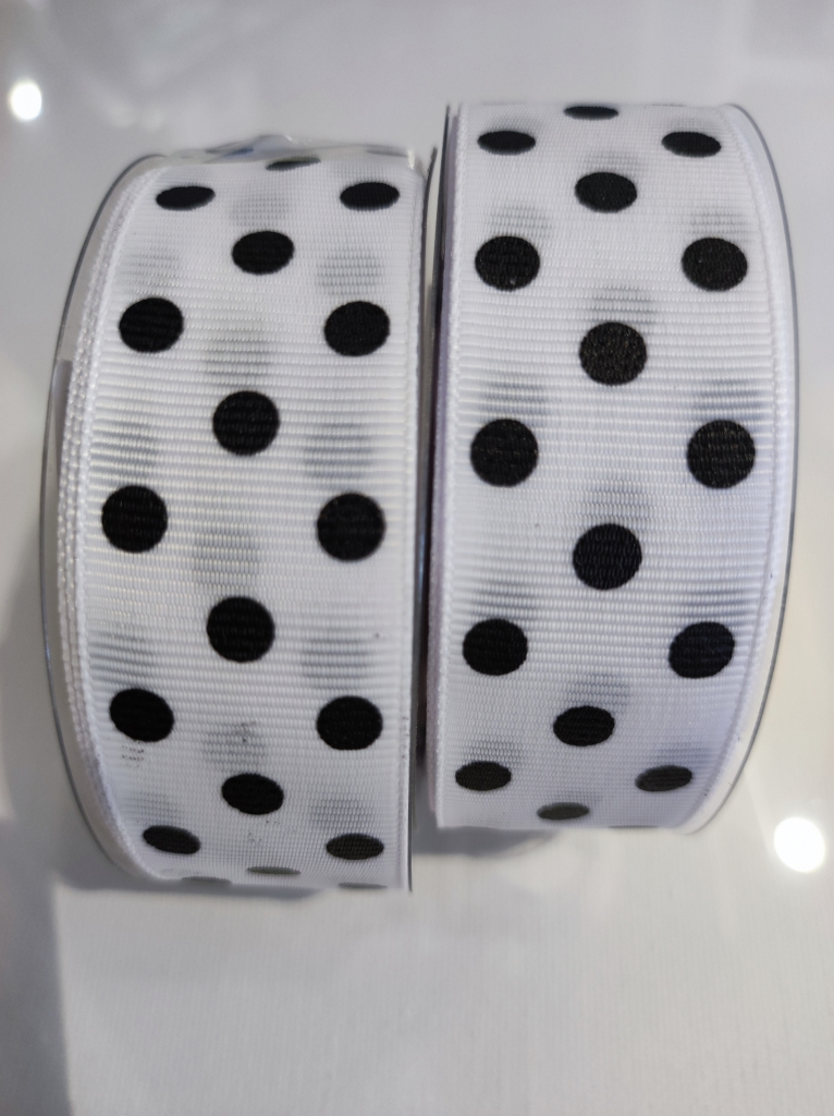 Ripsinė juostelė balta su juodais taškeliais 2,5cm22,5m