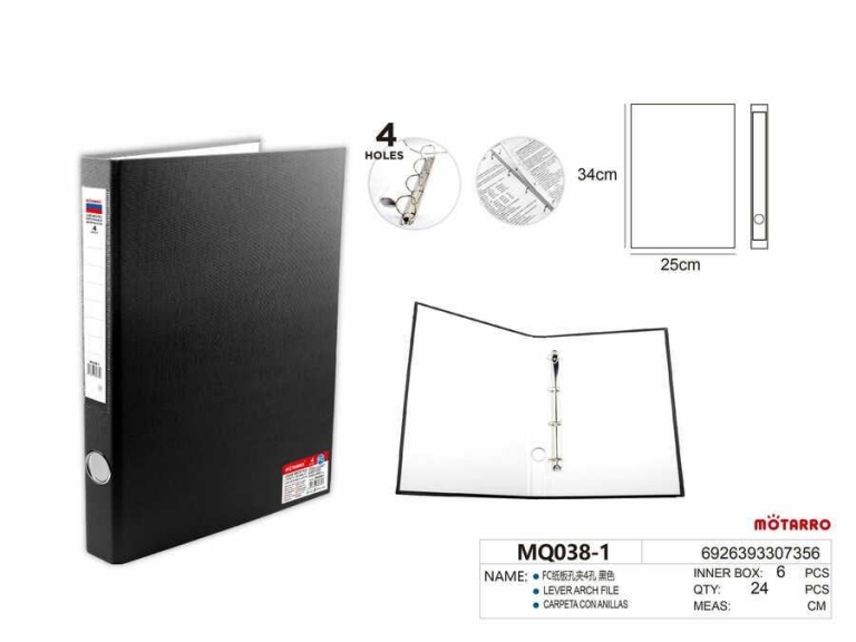 Segtuvas A4 40mm 4-ių žiedų juodos spalvos MOTARRO – tai puikus pasirinkimas tiek mokiniams, tiek profesionalams, ieškantiems patikimo ir stilingo dokumentų saugojimo sprendimo. Šis segtuvas ne tik padės jums organizuoti svarbius dokumentus, bet ir suteiks jūsų darbo erdvei modernios išvaizdos.
