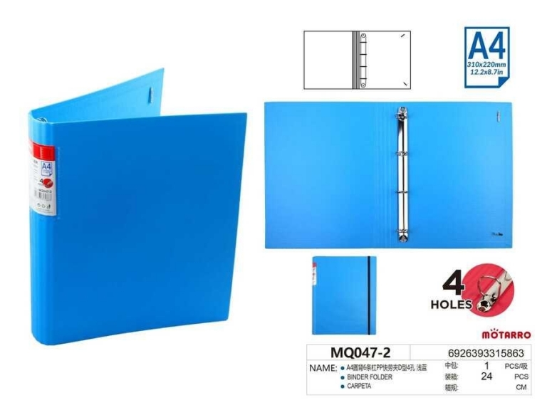 Segtuvas A4 40mm 4-ių žiedų mėlyvos spalvos su guma MOTARRO
