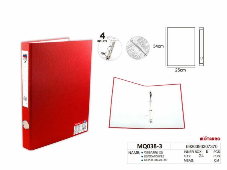 Segtuvas A4 40mm 4-ių žiedų raudonos spalvos MOTARRO