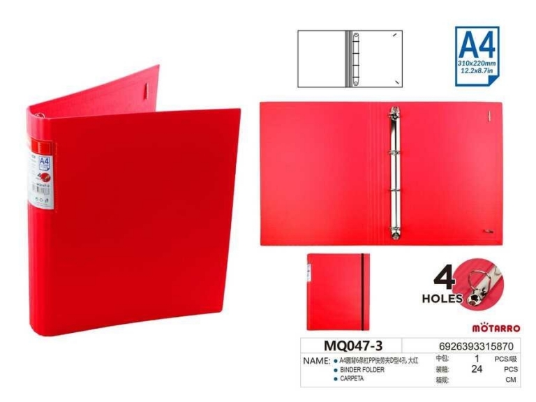 Segtuvas A4 40mm 4-ių žiedų raudonos spalvos su guma MOTARRO