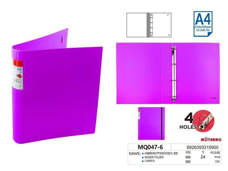 Segtuvas A4 40mm 4-ių žiedų violetinės spalvos su guma MOTARRO