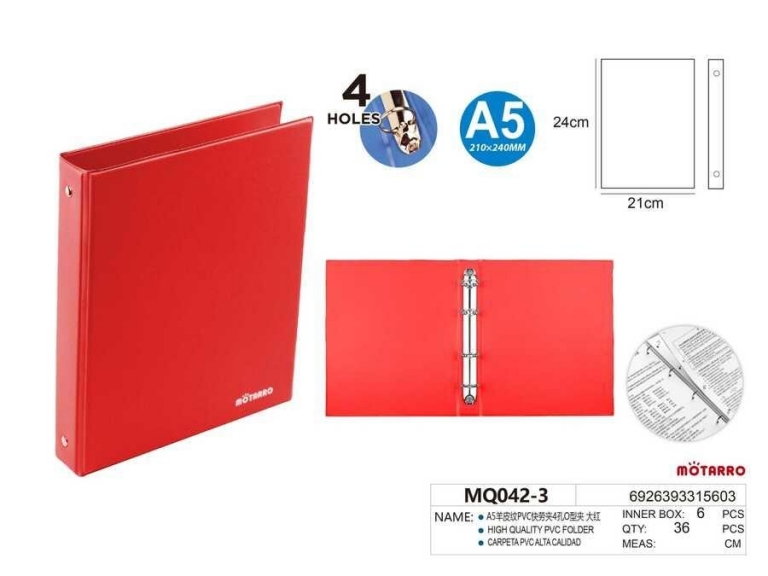 Segtuvas A5 35mm 4-ių žiedų raudonos spalvos MOTARRO