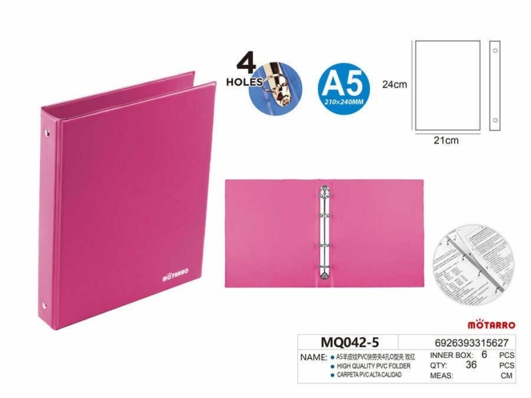 Segtuvas A5 35mm 4-ių žiedų rožinės spalvos MOTARRO