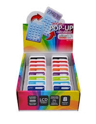 Skaičiuotuvas pedengtas silikonu puikiai tilps penale. Neslidus paviršius, kojelė patogesniam kampui pastatyti. LCD ekranas, 8 skaičiai, maitinimas elementu SR54 (komplekte). Pakuojami po 16vnt.