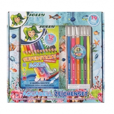 12 spalvų pieštukai, galima dažyti vandeniu, ryškios spalvos, nedūžtanti danga ir akvarelės švinas suteikia dar daugiau kūrybiškumo tapyti ir piešti. Geras spalvų trynimas ir didelis spalvų ryškumas sukuria puikius efektus net ant tamsaus popieriaus. Vandeniu dažytas akvarele storas šerdies užpildas, sustiprinta medžio danga, ypač sodri spalva, gražūs akvarelės efektai leidžia piešti piešinius teptuku. Pakuotėje yra šių spalvų akvareliniai pieštukai: 102 šviesiai geltona, 104 oranžinė, 106 vyšnių raudona, 109 rožinė, 110 odos spalva, 111 violetinė, 112 šviesiai mėlyna, 114 tamsiai mėlyna, 116 turkio, 17 smaragdo žalia, 21 vidutinio ruda, 22 JOLLY tamsiai rudi trikampiai šepečiai (6 vnt. k) 6 akvarelės ir aliejinių dažų teptukai (FSC) apvalūs teptukai 6, 8, 10, 10, 12 su rausvais toray šereliais, labai gerai sugeria spalvą, lengvai valomas, ergonomiška trijų taškų rankenos sritis, neoninės spalvos, akvarelės blokas