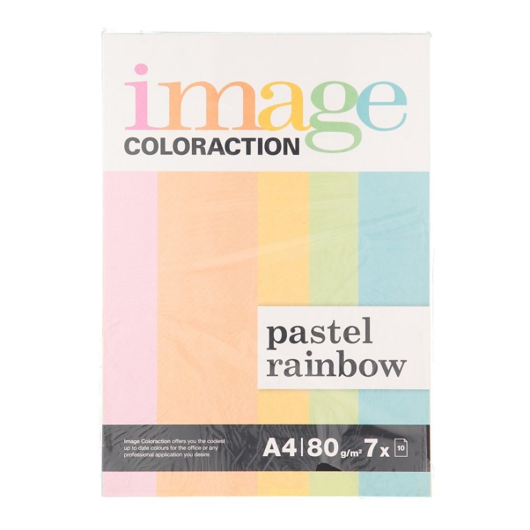 IMAGE COLORACTION“ spalvotas popierius. A4 formatas. Tinka kopijavimui, lazeriniams ir rašaliniams spausdintuvams, fakso aparatams. 7 pastelinės spalvos. Popieriaus svoris 80 g/m2. Pakuotėje 70 lapų.