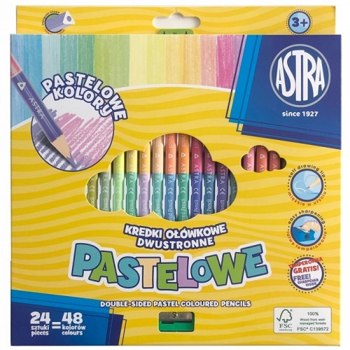Spalvoti pieštukai 24=48sp.dvipusiai, tribriauniai, pastelinės sp., ASTRA