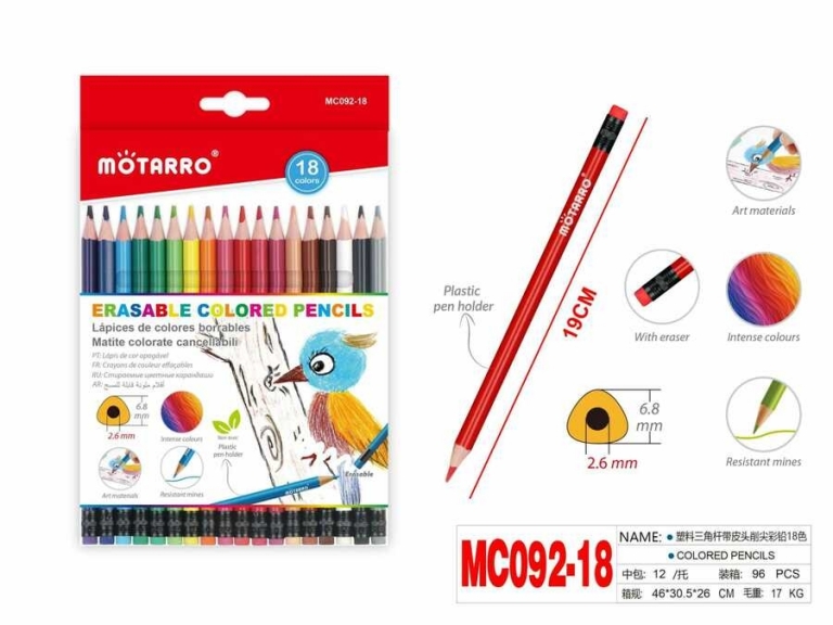 Spalvoti pieštukai MOTARRO 18 spalvų su trintuku – puikus pasirinkimas tiek vaikams, tiek suaugusiems, siekiantiems išlaisvinti savo kūrybiškumą! Šie pieštukai ne tik siūlo platų spalvų spektrą, bet ir yra patogūs naudoti, todėl idealiai tinka piešimui, eskizavimui ir įvairioms meno technikoms.